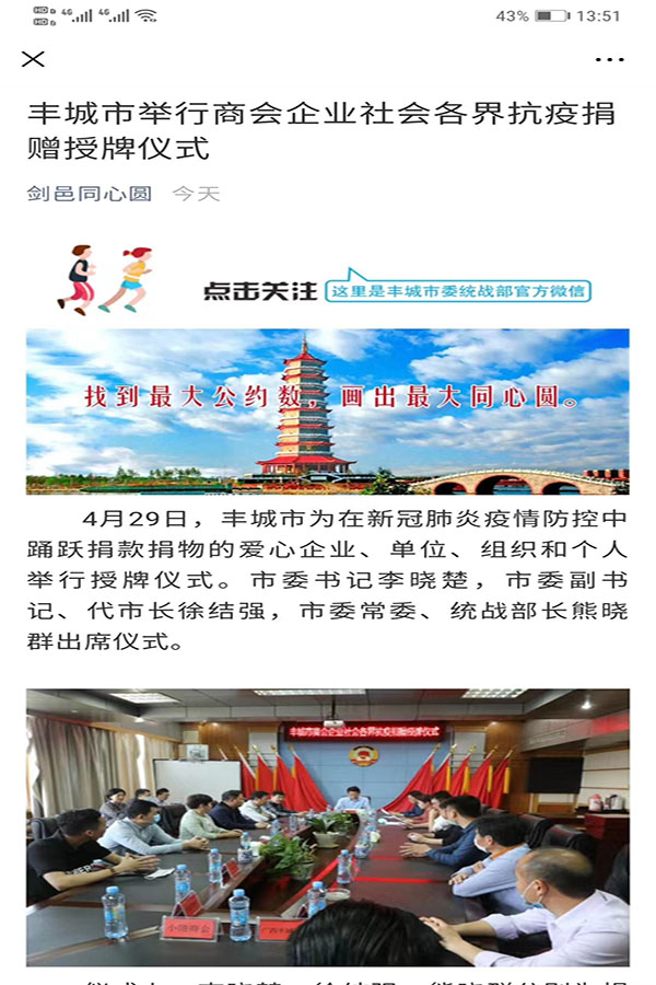 4月29日,江西省豐城市為在新冠肺炎疫情防控中踴躍捐款捐物的愛(ài)心企業(yè)、單位、組織和個(gè)人舉行授牌儀式, 市委書(shū)記李曉楚、市委副書(shū)記、代市長(zhǎng)徐結(jié)強(qiáng)、市委常委統(tǒng)戰(zhàn)部長(zhǎng)熊曉群出席儀式。