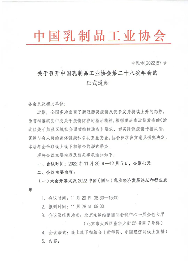 關(guān)于召開中國乳制品工業(yè)協(xié)會第二十八次年會的正式通知